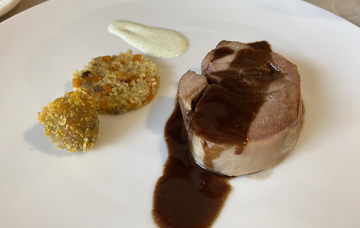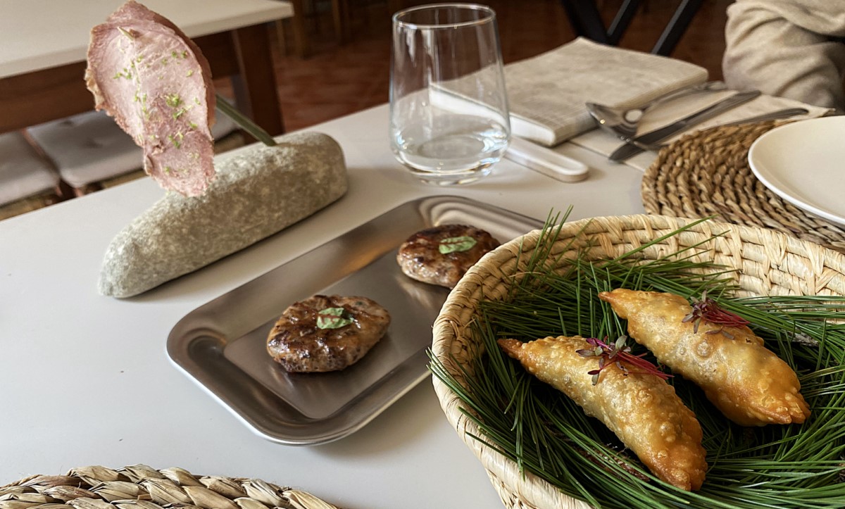 El jabalí se presenta en varias elaboraciones: figatell, empanadilla y jamón ahumado. El figatell resulta sabroso, a pesar de que admitiría un punto más de pimienta; la empanadilla tenía una textura exterior crujiente y un interior suave, mientras que el jamón, demasiado seco, es lo menos acertado del conjunto.
