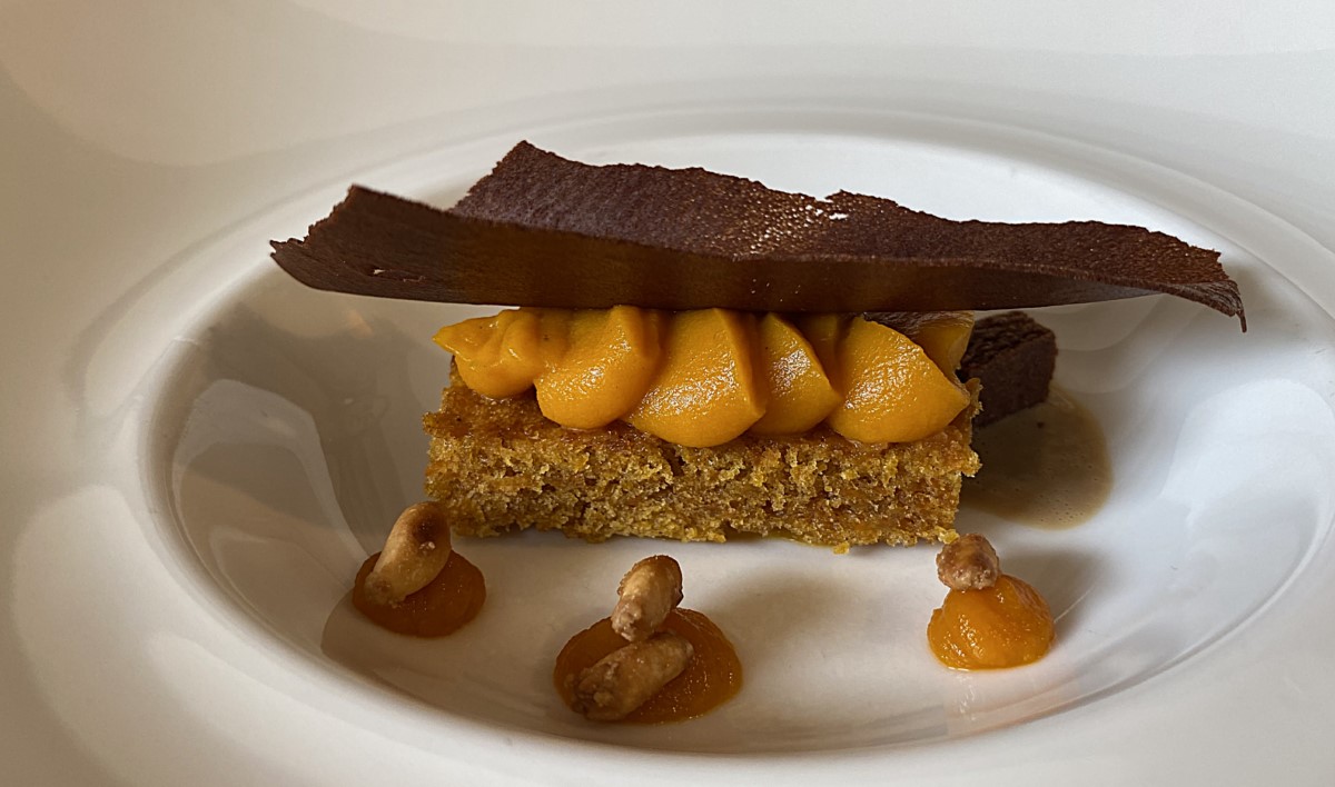 La segunda propuesta une calabaza, piñones, café, bizcocho de zanahoria y chocolate, con una gran coherencia de sabores y una crema inglesa de café especialmente acertada.