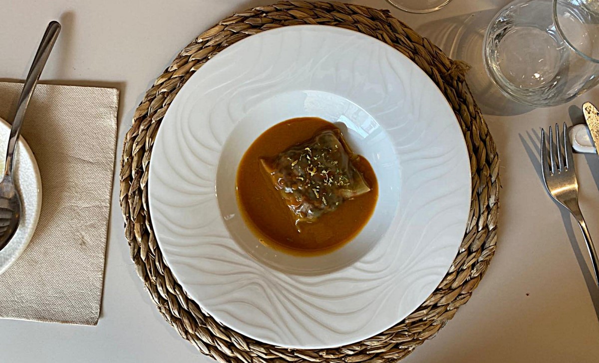 El ravioli de acelga y gamba roja nos encantó por su melosidad y un sabor intenso y fino, es en uno de los platos más elegantes del menú.