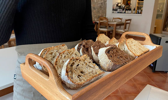 La comida se inicia con una selección de tres panes artesanos de masa madre, de harina de algarroba y de centeno con semillas, acompañados de un aceite de oliva blanqueta de la almazara l’Alqueria de Muro.