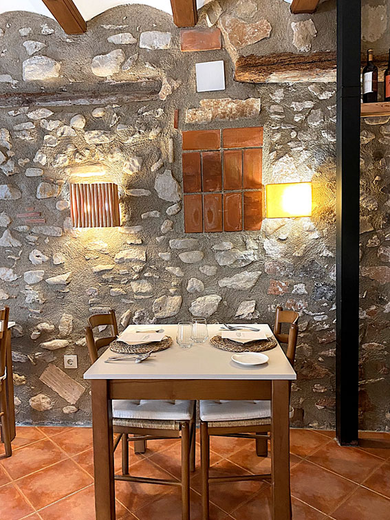 Paseando por las calles estrechas que rodean la plaza donde se encuentra el restaurante, llaman la atención los detalles pintados de azul de las casas, que recuerdan a Chefchaouen, la perla azul del Marruecos, una ciudad que justo la noche anterior habíamos visto en un reportaje. El local, pequeño y de estética acogedora, se integra perfectamente en el entorno e invita a disfrutar de una experiencia gastronómica genuina.