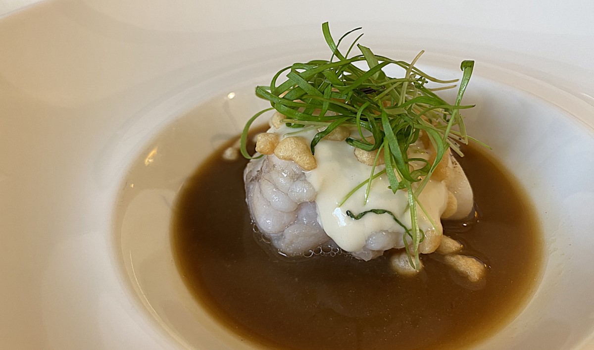 El primer principal, el rape con suc de galera y pilpil, cocido en su punto, con la carne suave y firme a la vez. El pilpil aporta cremosidad, mientras que el suc de galera aporta un sabor intenso que equilibra el plato perfectamente.
