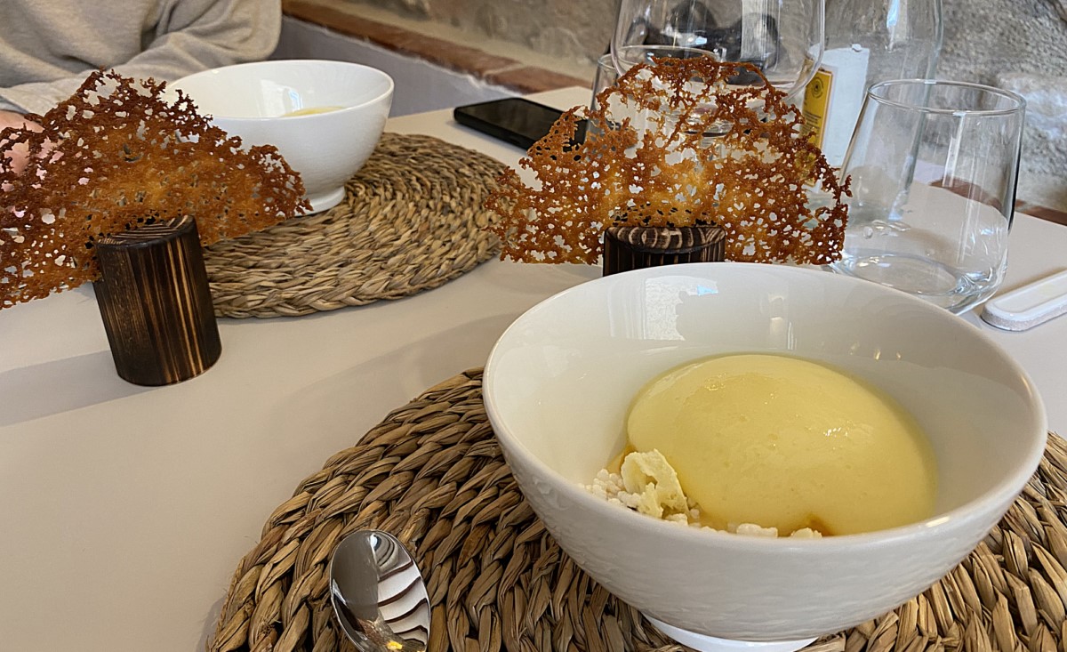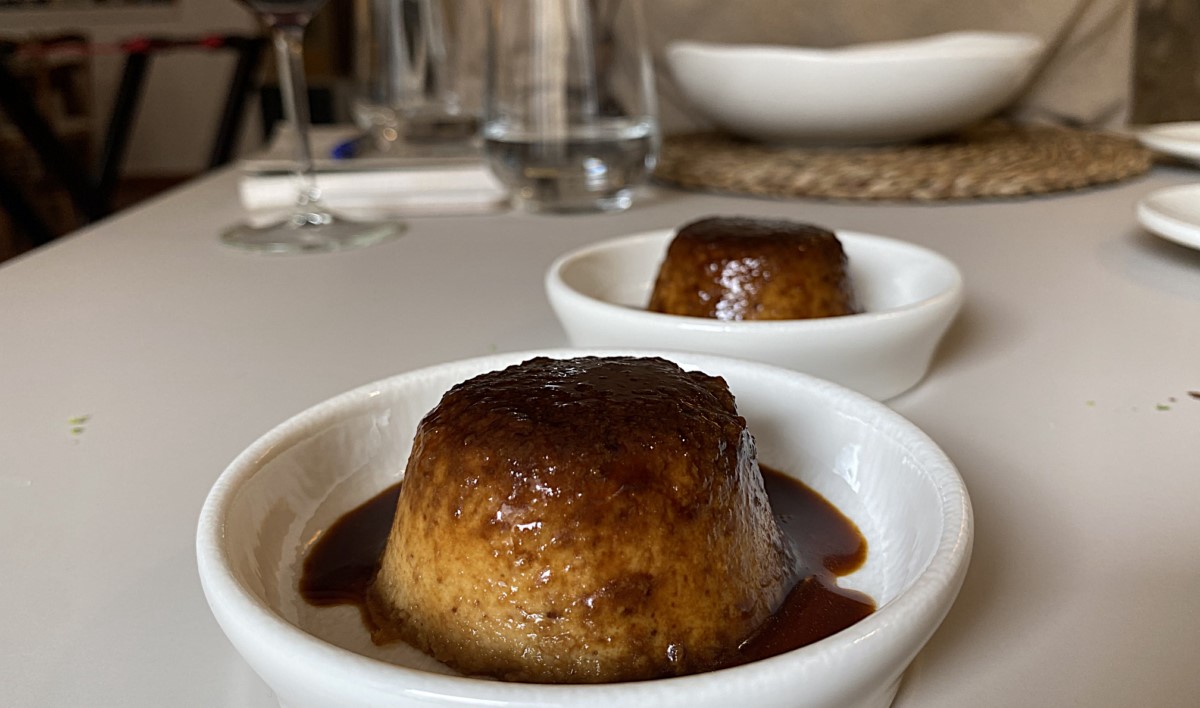 Uno de los platos más equilibrados del menú es el ajo blanco de gamba blanca con cebolla a la llama, fresco y con un toque cítrico muy bien integrado. La cebolla aporta profundidad y redondea el plato. De esta cebolla, Pablo prepara un flan salado de una cremosidad muy agradable, con una dulzura que recuerda unos postres y una estructura densa y sorprendente.
