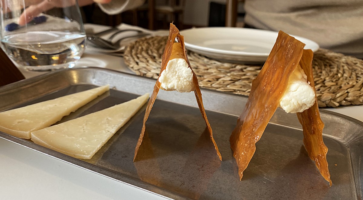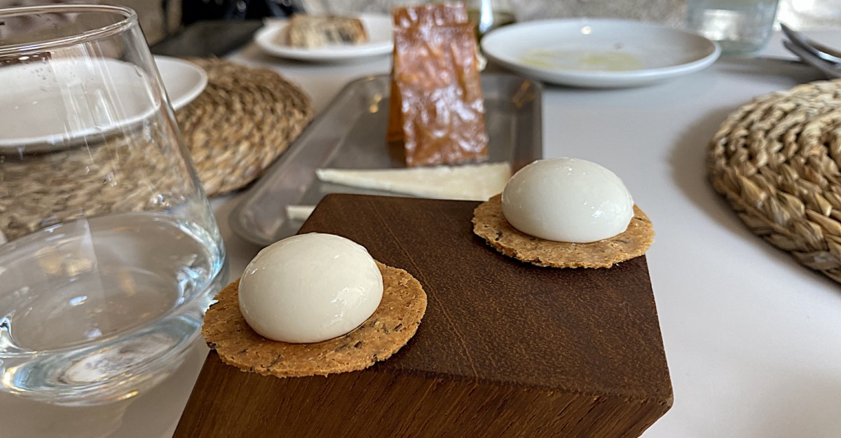 El primer entrante es una degustación de queso de cabra en tres formatos: el sándwich de cabra entre láminas dulces y crujientes, donde el contraste de texturas y sabores es brutal. Un madurado, y una esfera de cabra que sorprende por su frescura y su interior fluido que explota y se esparce por la boca. Muy bien ejecutado.