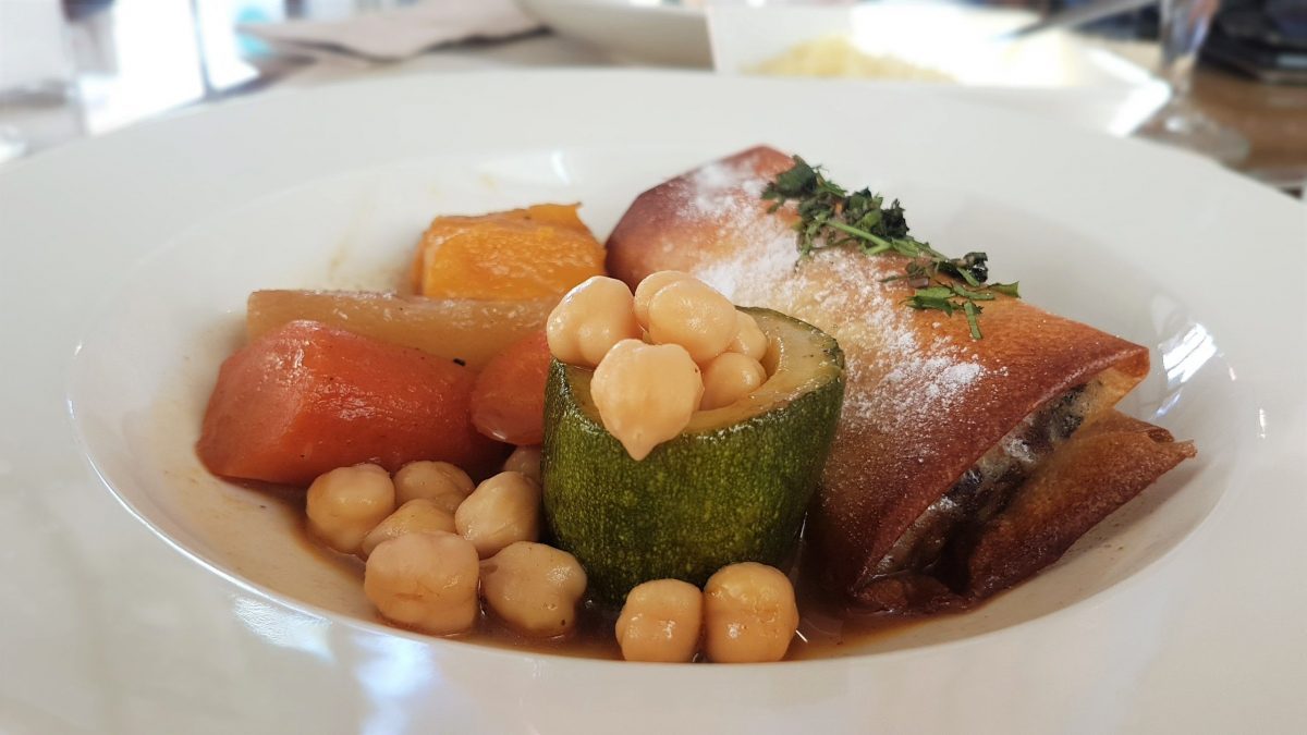 Cous cous de verduras y pastela de cordero. la intensidad del caldo es muy potente, contarsta con las verduras y legumbres que están al dente, da gusto que hagan crish crish al morderlas. Quizá para otros resulten poco hechas, pero claro, así es como encuentras el verdadero sabor de cada una. el caldo con el cous cous , fantástico. La pastela muy equilibrada de sabor. potente, pero le he de poner una pequeña pega, un poco demasiado seca, ¿demasiado tostada quizà?, pero bueno quitando de este pequeño detalle, un platazo.